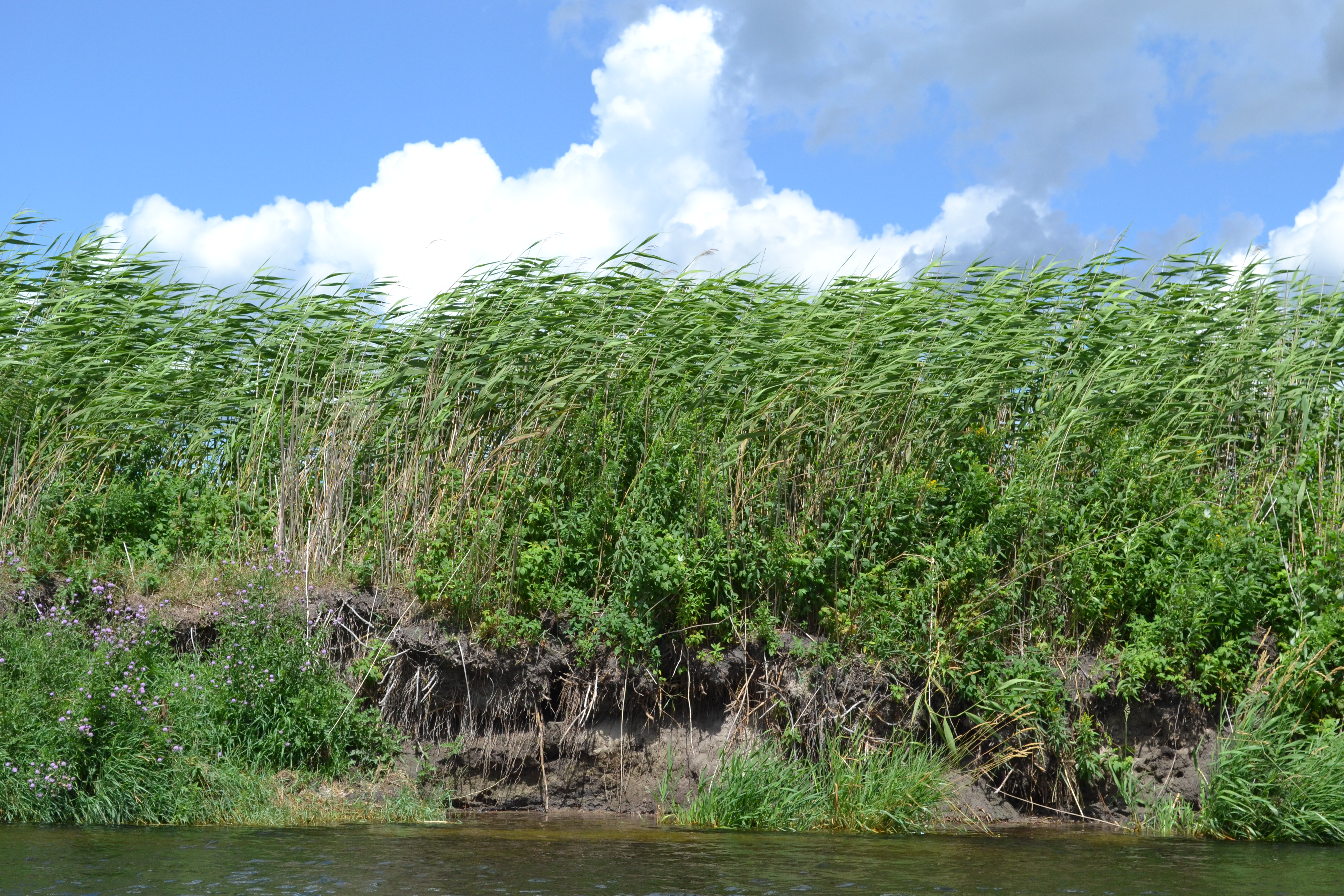 Erosion also occurs on sites where no dredging occurs. Here, mature vegetation can collapse as soil is washed away by the river’s current.